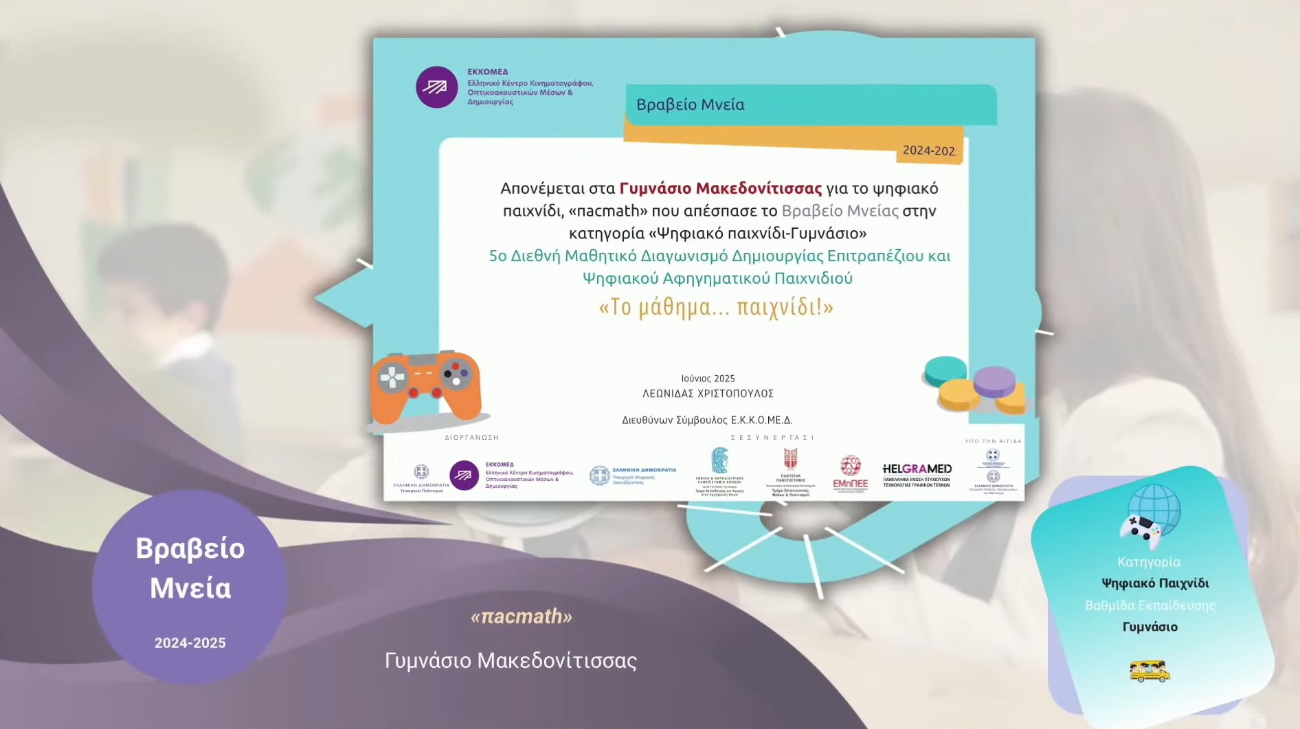 Ο Χρήστος Κωνσταντινίδης του Β7 έλαβε μέρος στο 5ο Διεθνή Μαθητικό Διαγωνισμό Δημιουργίας Επιτραπέζιου και Ψηφιακού Παιχνιδιού που διοργανώνει ο ΕΚΚΟΜΕΔ στην Ελλάδα τη σχολική χρονιά 2024 -2025 με το ψηφιακό παιχνίδι «πacmath» και απέσπασε το βραβείο Μνείας στην κατηγορία «Ψηφιακά Παιχνίδια – Γυμνασίου». Ο μαθητής βραβεύτηκε στις 9 Δεκεμβρίου 2025 σε μια επίσημη τελετή που πραγματοποιήθηκε στο Ίδρυμα Μείζονος Ελληνισμού στην Αθήνα.