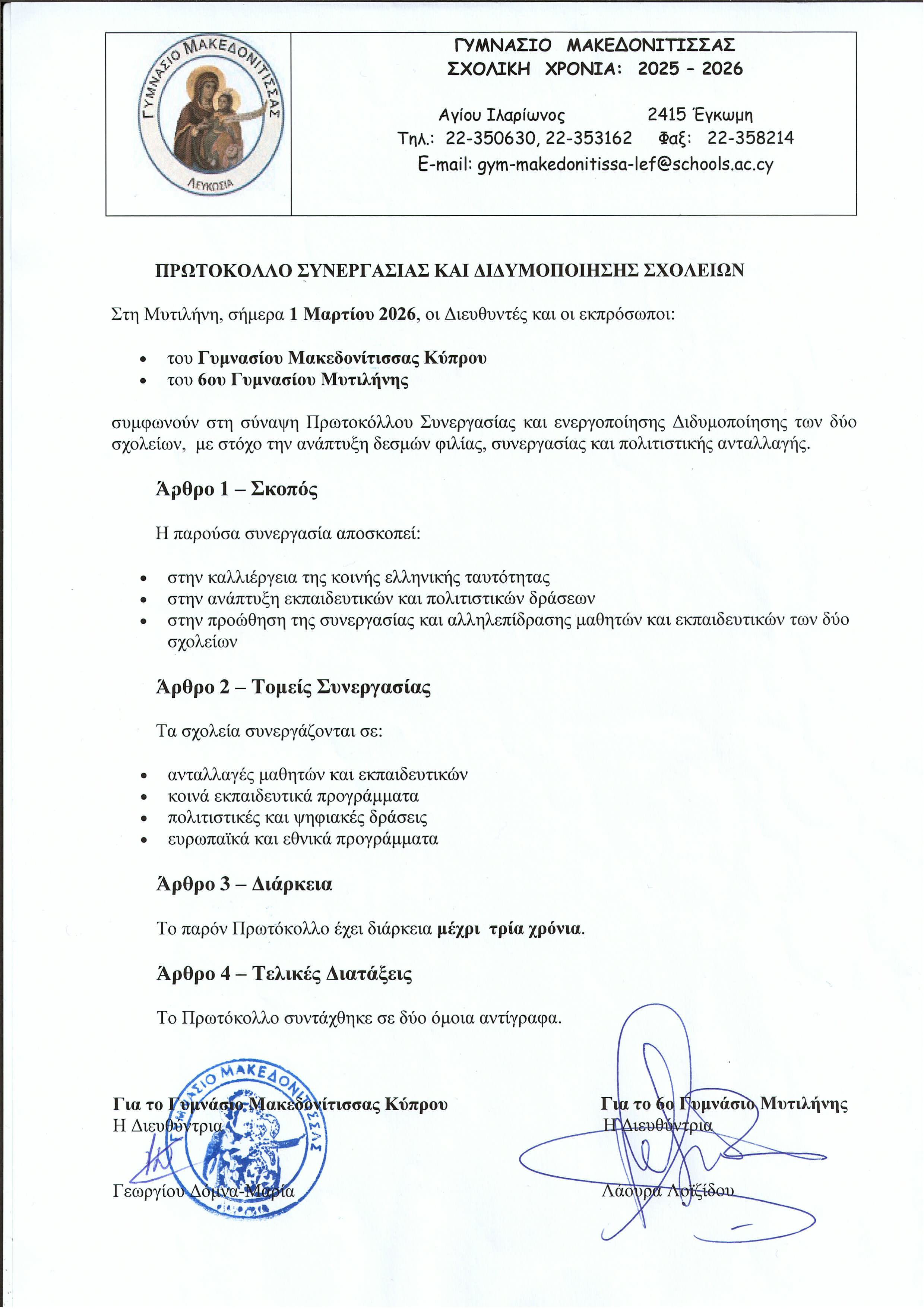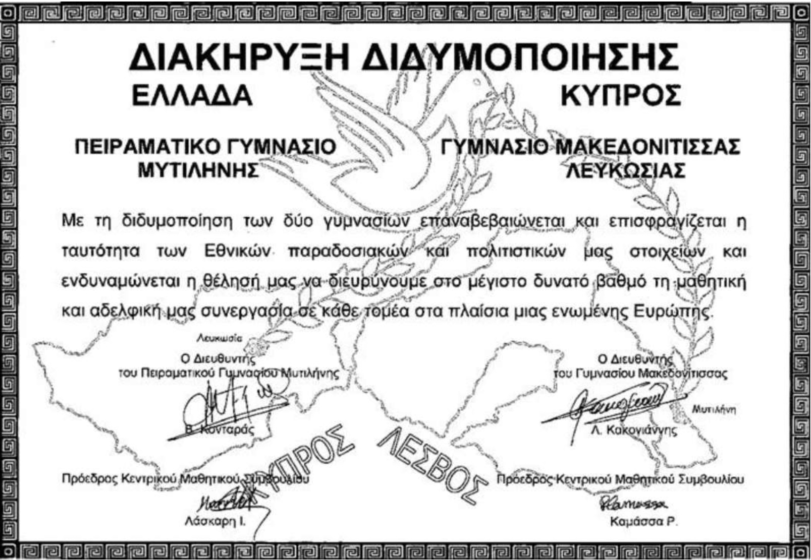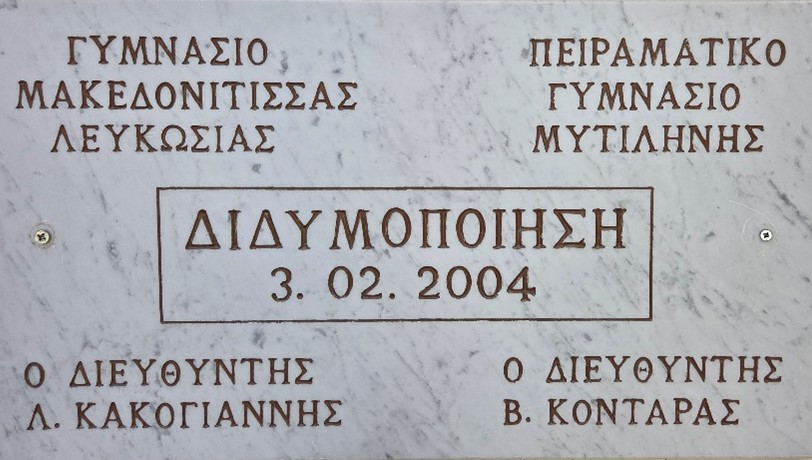 Στις 3/2/2004 διδυμοποιήθηκε το Γυμνάσιο Μακεδονίτισσας με Πειραματικό Γυμνάσιο Μυτιλήνης.